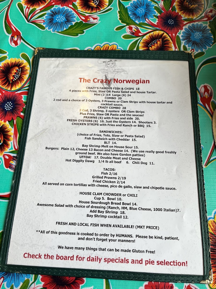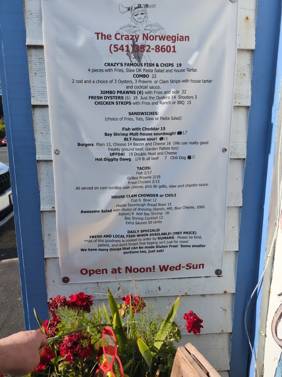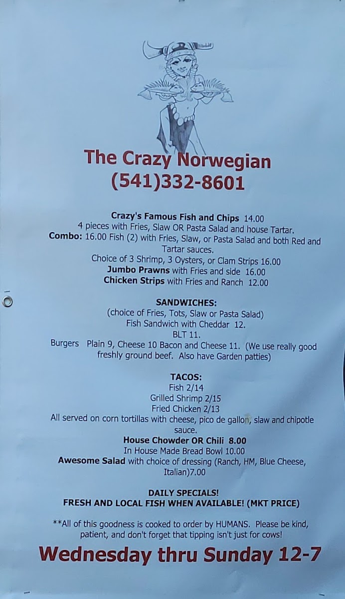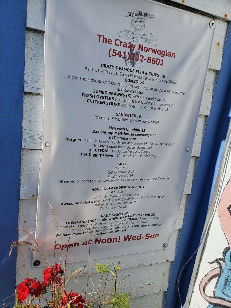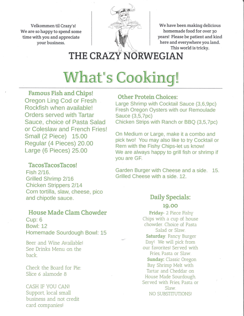 Welcome to The Crazy Norwegian's Fish & Chips, where we're passionate about bringing you the freshest and most delicious seafood right here in Port Orford! Nestled at 259 6th St, our menu is a treasure trove of mouthwatering specialties that will tantalize your taste buds. Whether you're in the mood for our crispy Fish Tacos or the ever-popular Fish and Chips paired with a delightful Pasta Salad, there's something for everyone. Don't miss out on our indulgent Marionberry Pie, refreshing Cranberry Lemonade, and the cozy warmth of our Clam Chowder Bowl. For those craving something a bit different, try the Crab Melt or Coconut Shrimp! With juicy Shrimp Tacos, hearty Chili, and a selection of tempting desserts like Blueberry Pie and Coconut Crème Pie, your culinary adventure awaits. Bring your family and friends, and let us treat you to a feast of flavors that will leave you chanting for more!