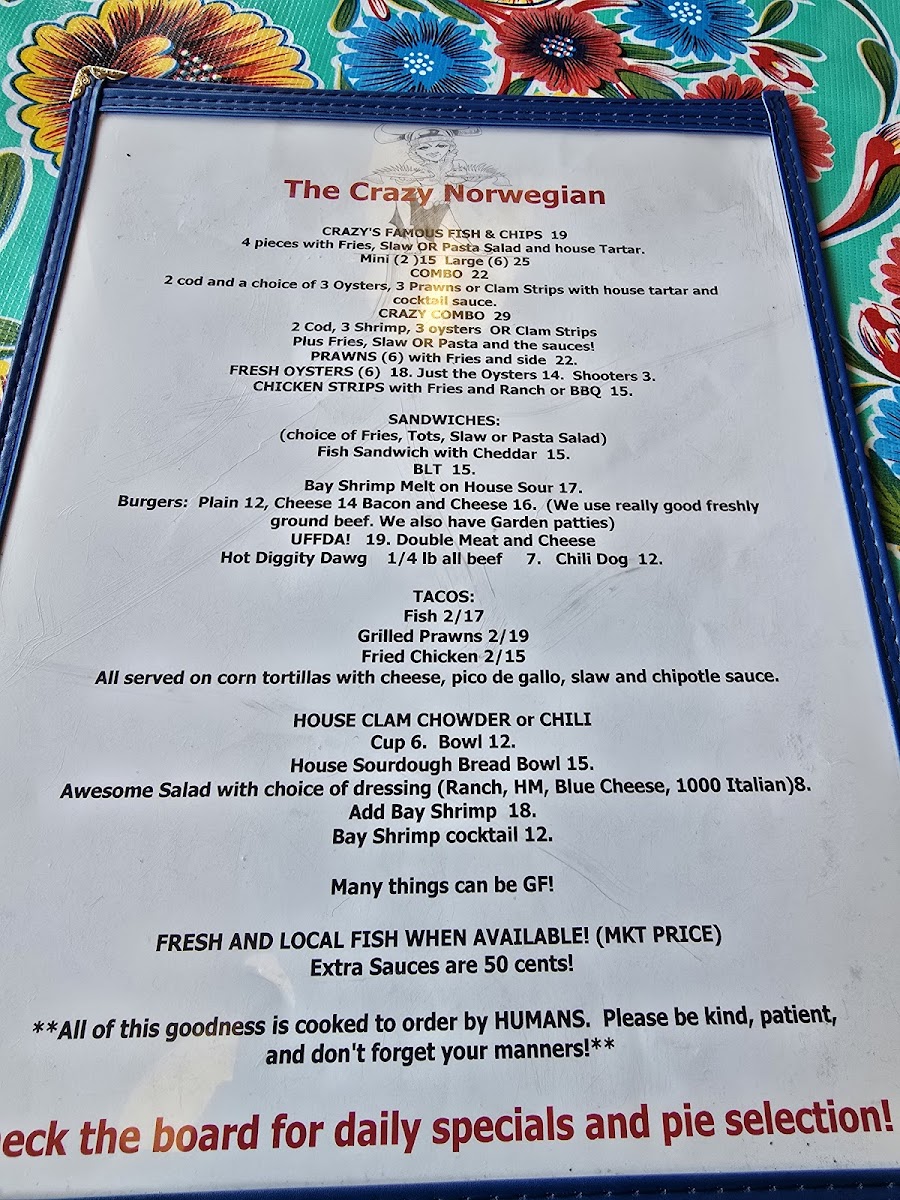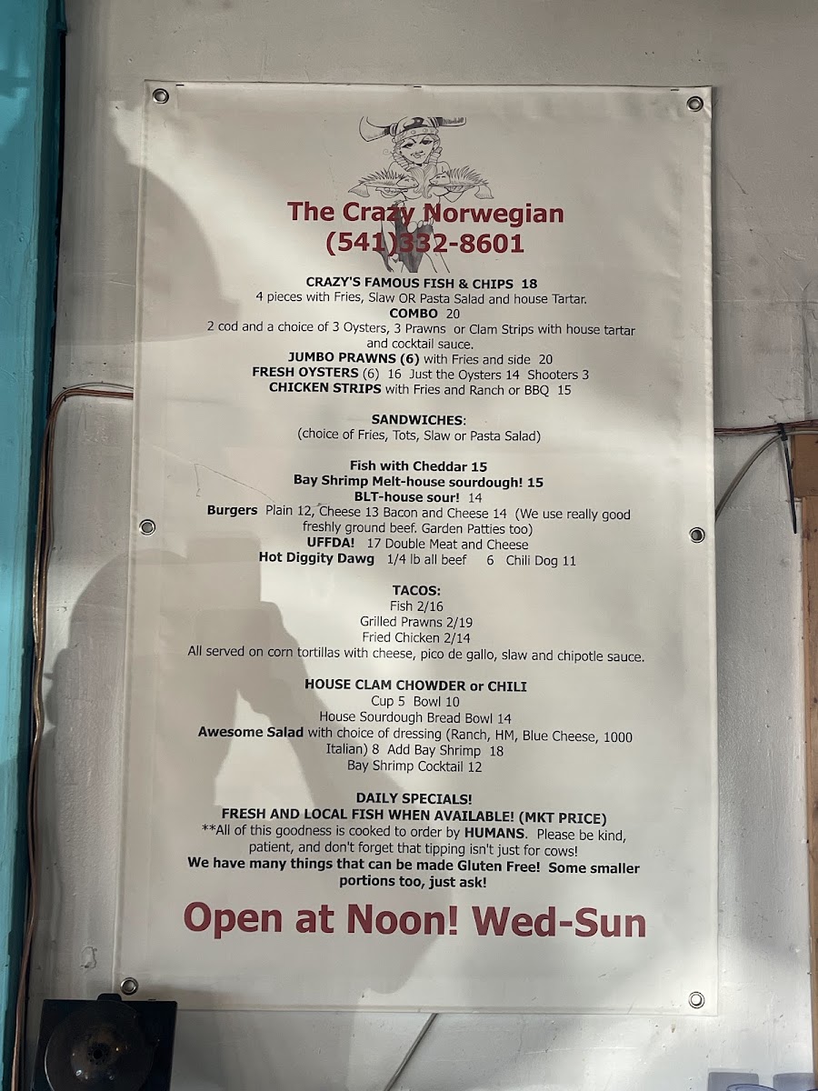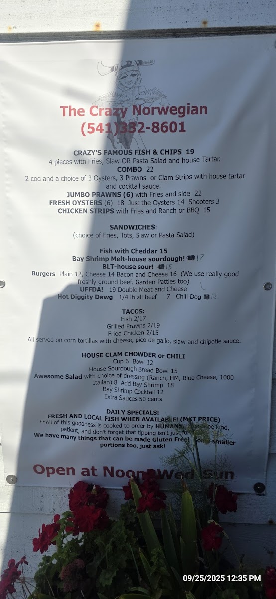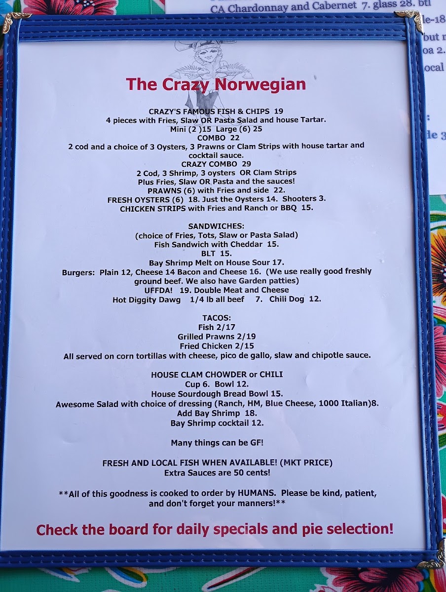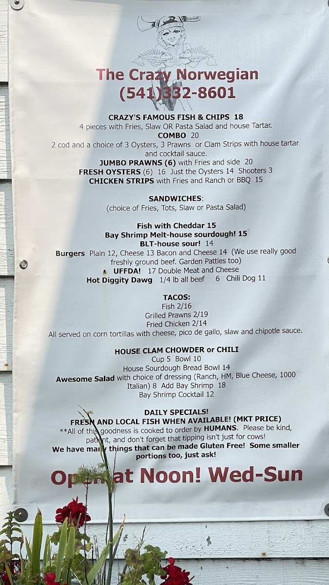 Welcome to The Crazy Norwegian's Fish & Chips, where we're passionate about bringing you the freshest and most delicious seafood right here in Port Orford! Nestled at 259 6th St, our menu is a treasure trove of mouthwatering specialties that will tantalize your taste buds. Whether you're in the mood for our crispy Fish Tacos or the ever-popular Fish and Chips paired with a delightful Pasta Salad, there's something for everyone. Don't miss out on our indulgent Marionberry Pie, refreshing Cranberry Lemonade, and the cozy warmth of our Clam Chowder Bowl. For those craving something a bit different, try the Crab Melt or Coconut Shrimp! With juicy Shrimp Tacos, hearty Chili, and a selection of tempting desserts like Blueberry Pie and Coconut Crème Pie, your culinary adventure awaits. Bring your family and friends, and let us treat you to a feast of flavors that will leave you chanting for more!